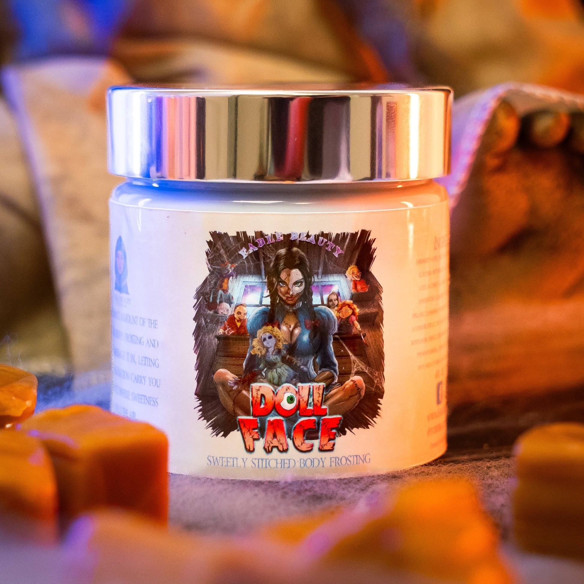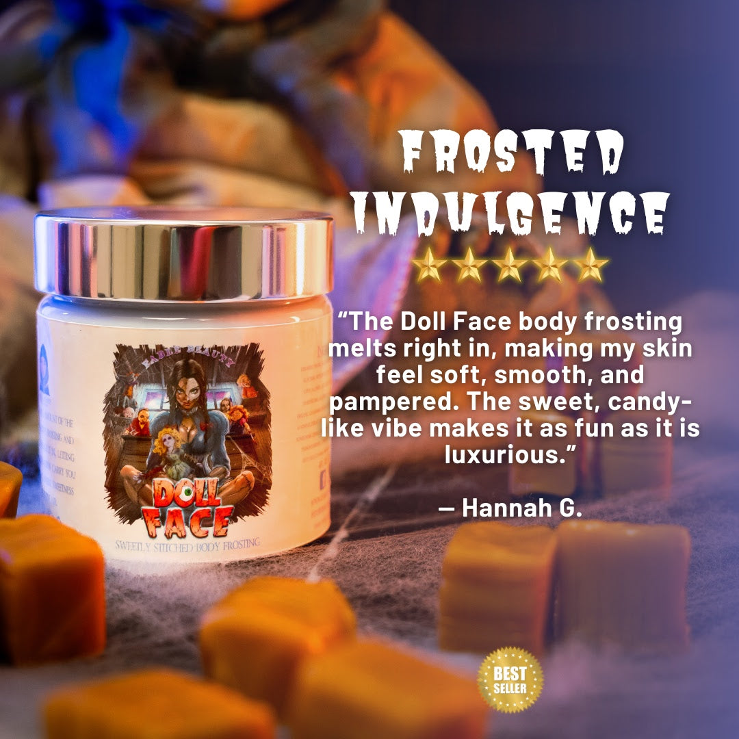Indulge in haunting perfection with Doll Face, Fable Beauty’s whipped Body Frosting made for those who embody delicate charm and stitched-together allure. This rich, hydrating 4oz jar melts into your skin like golden silk—luxurious, smooth, and impossible to resist—while the scent wraps you in a decadent embrace of sweetness and obsession.