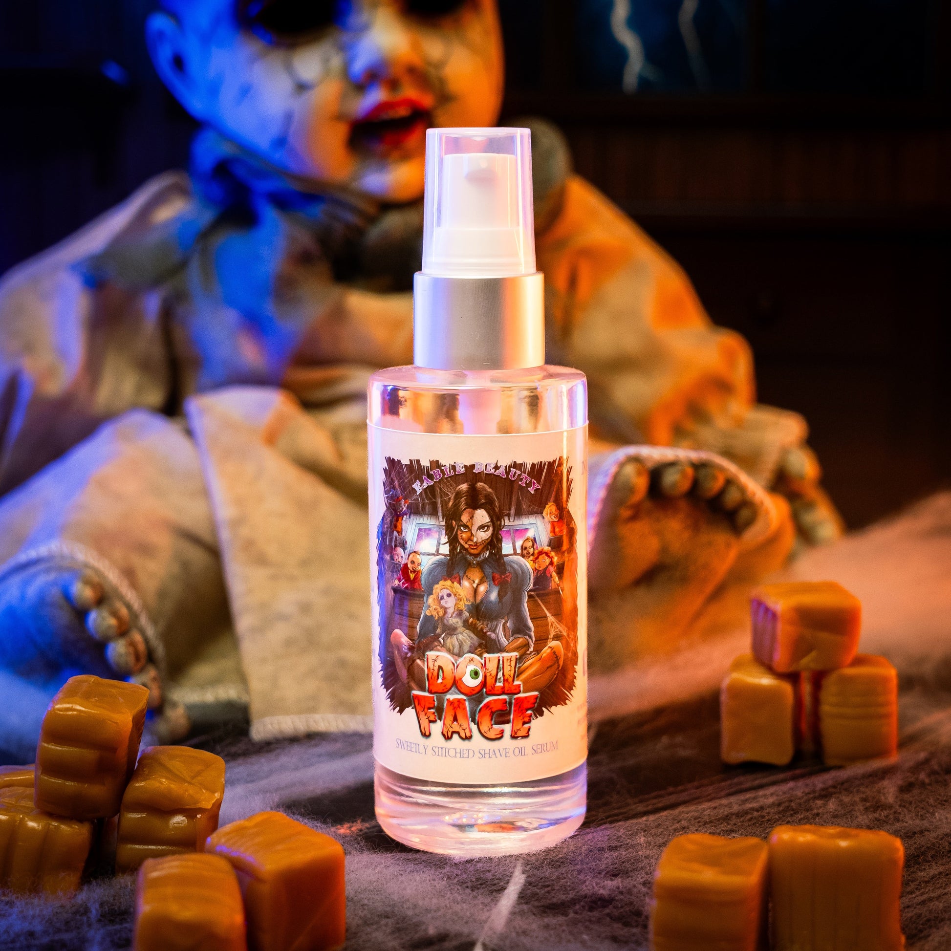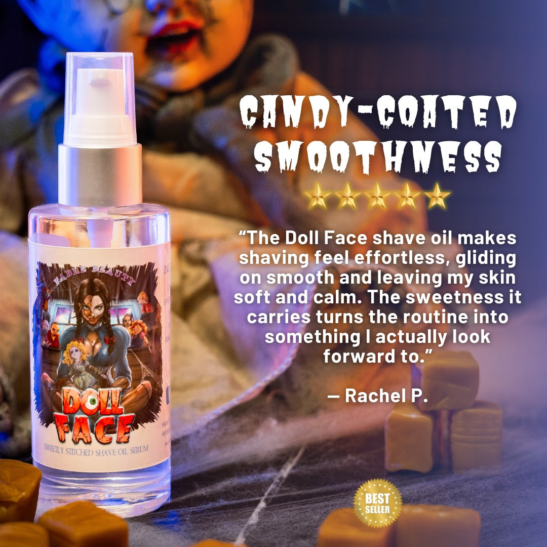 Every close shave deserves a touch of flawless beauty. Doll Face is Fable Beauty’s Shave Oil Serum, crafted for the haunting creation brought to life by the Doll Maker’s hand—delicate, enchanting, and unforgettable. This ultra-silky 2oz blend of nourishing oils glides on like golden silk, cushioning every stroke while leaving your skin soft, hydrated, and kissed with indulgent sweetness.
