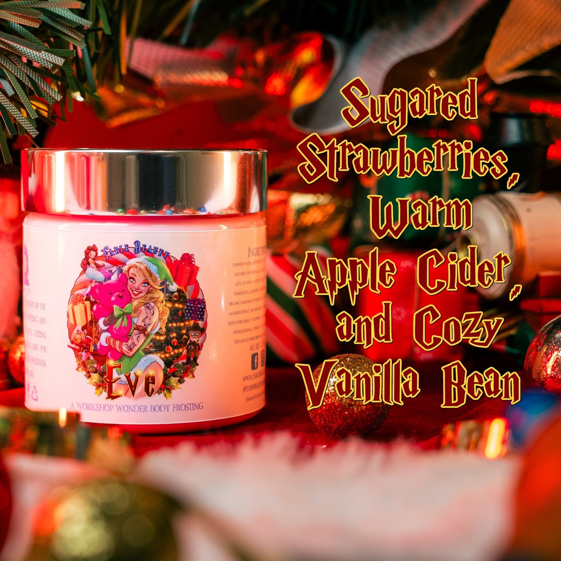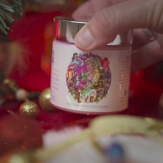 Step into the joyful magic of Eve, the Christmas Eve elf who adores presents, twinkling lights, and all things sweet and festive. This decadent 4oz whipped Body Frosting melts effortlessly into your skin with a cloud-light texture as soft as freshly fallen snow. It leaves your skin silky, nourished, and glowing with warm holiday radiance.