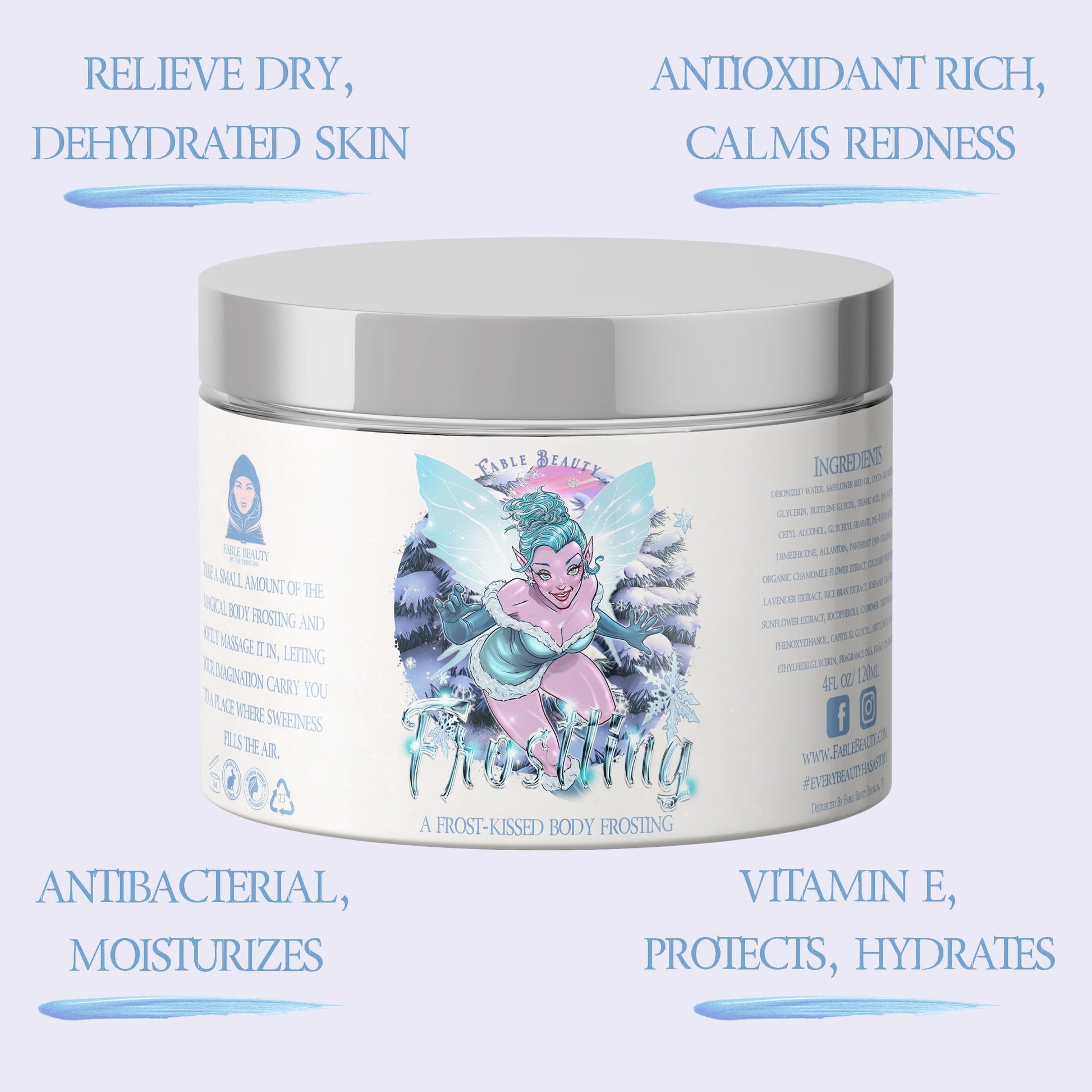 Body Frosting: Deionized Water, Safflower Seed Oil, Cocoa Seed Butter, Glycerin, Shea Butter, Cetyl Alcohol, Dimethicone, Organic Aloe Vera Leaf Extract, Lavender Extract, Fragrance Oils.