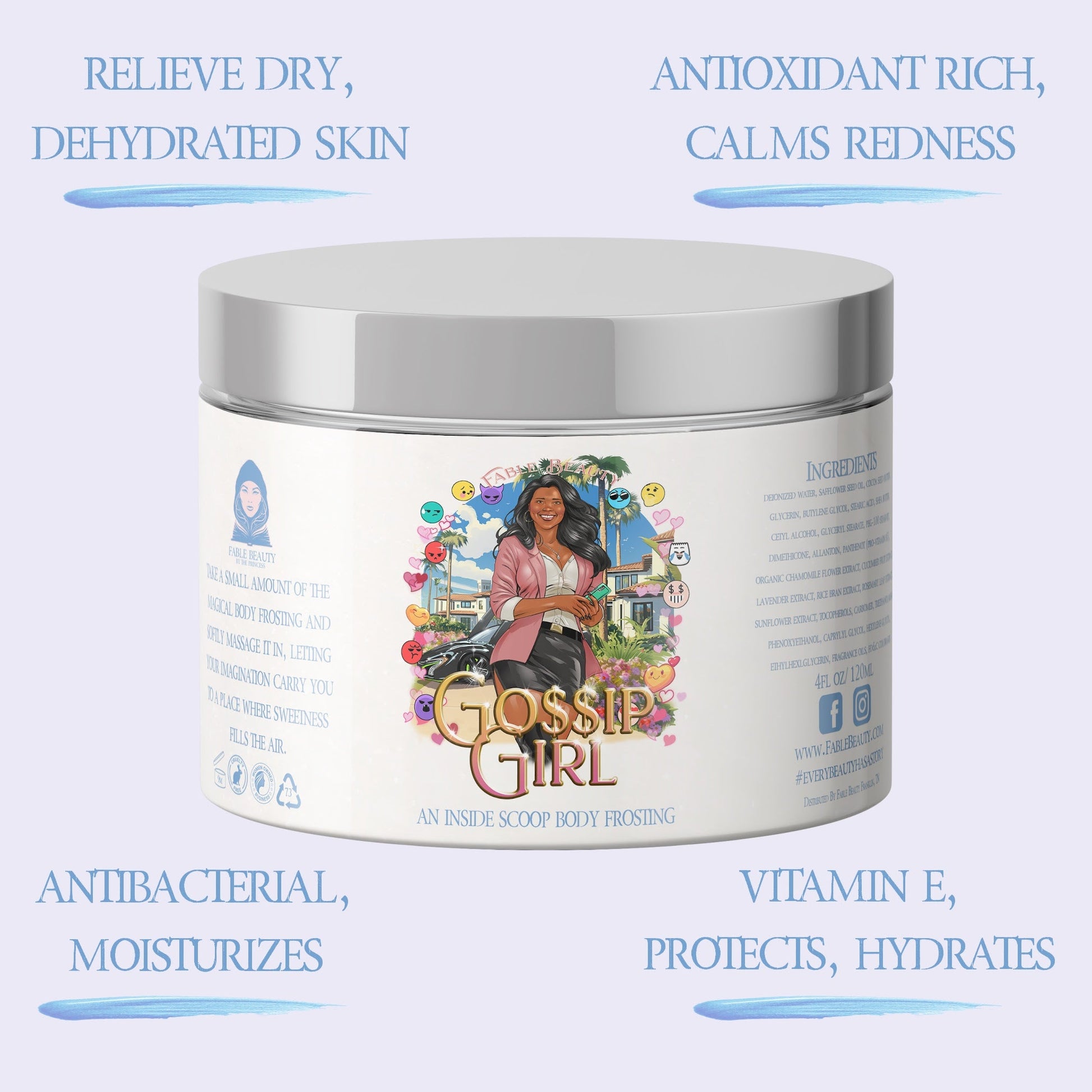 Indulge your skin like it just broke the internet. Gossip Girl is Fable Beauty’s whipped Body Frosting made for queens of the social spin, midnight text threads, and early morning glow-ups. This rich, hydrating 4oz jar melts into skin like the perfect comeback—fast, smooth, and impossible to ignore—while the scent wraps you in sweet scandal and citrus buzz.