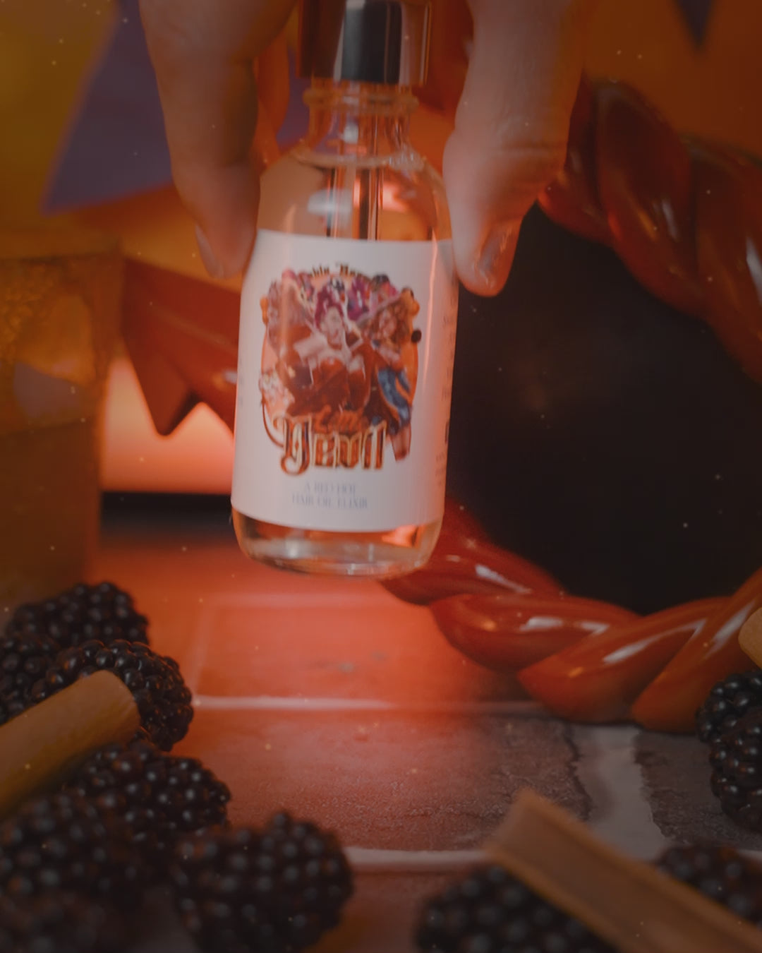 Warm a few drops of Little Devil Hair Oil Elixir between your palms. Apply to damp or dry hair, focusing on mid-length to ends. Use daily for silky, intoxicating strands kissed with wicked sweetness.
