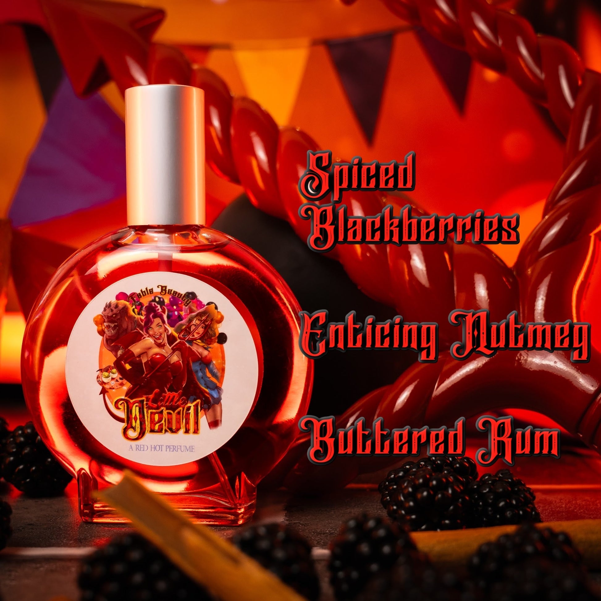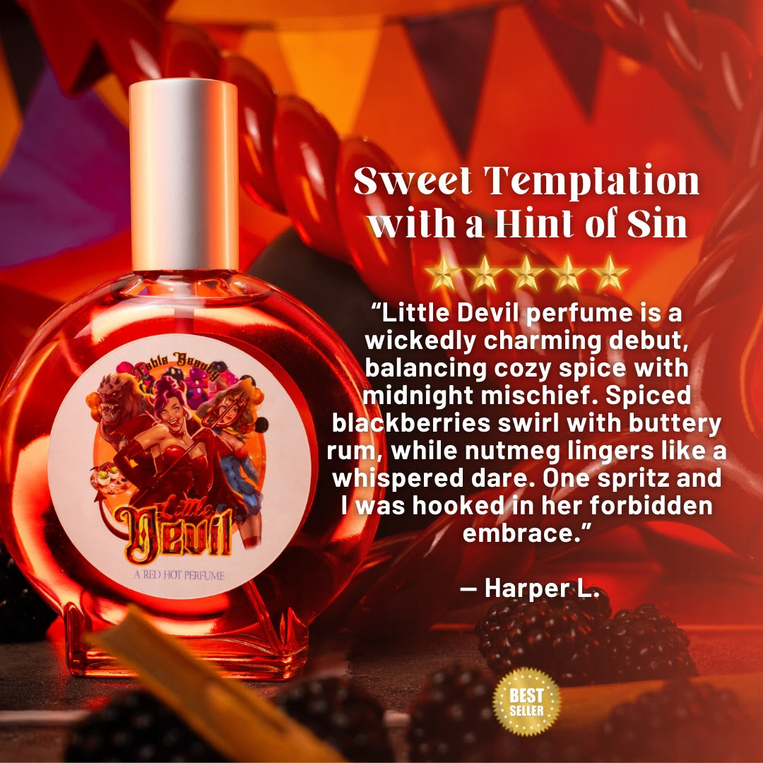 Crafted in the USA and phthalate-free, Little Devil is a captivating 100ml perfume elixir that wraps you in the dark sweetness of spiced blackberries, the warm tease of nutmeg, and the intoxicating burn of buttered rum. Each spritz is an invitation to give in to your wicked side.