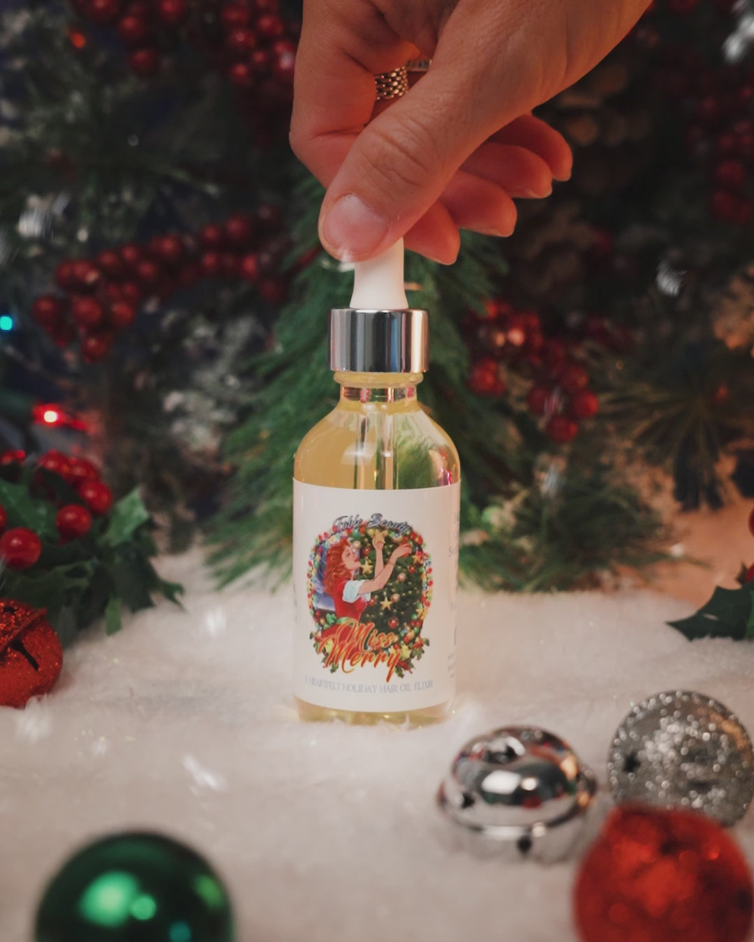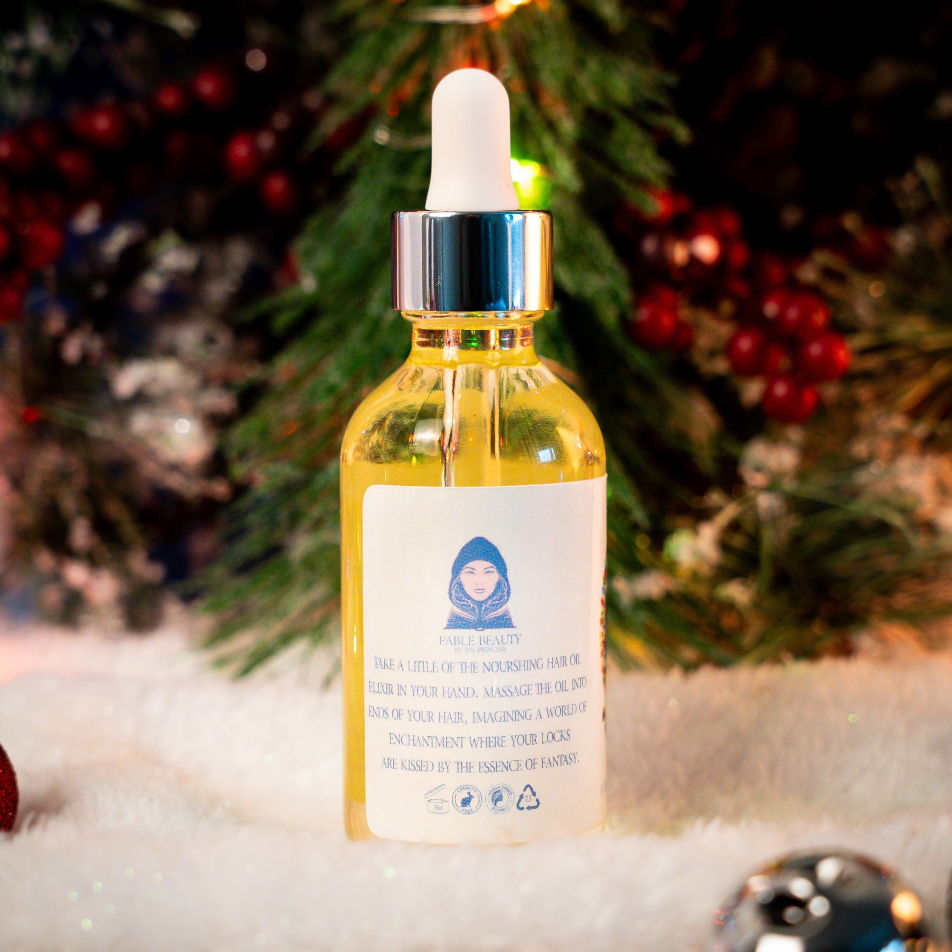 Unwrap your most radiant holiday hair with Miss Merry, Fable Beauty’s luxurious Hair Oil Elixir—a joyful blend of comfort, cheer, and winter sparkle. Crafted for those who crave soft, touchable hair and the spirit of the season in every drop, this lightweight 2oz blend nourishes deeply, tames frizz, and leaves your locks glowing with festive brilliance.