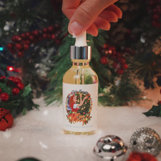 Warm a few drops of Miss Merry Hair Oil Elixir between your palms. Apply to damp or dry hair, focusing on mid-lengths and ends. Use daily for silky, luminous locks that shine as bright as the season itself.
