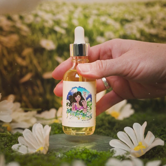Warm a few drops of Petal Wish Hair Oil Elixir between your palms. Apply to damp or dry hair, focusing on mid-lengths and ends. Use daily for smooth, glossy strands with soft meadowlight energy.