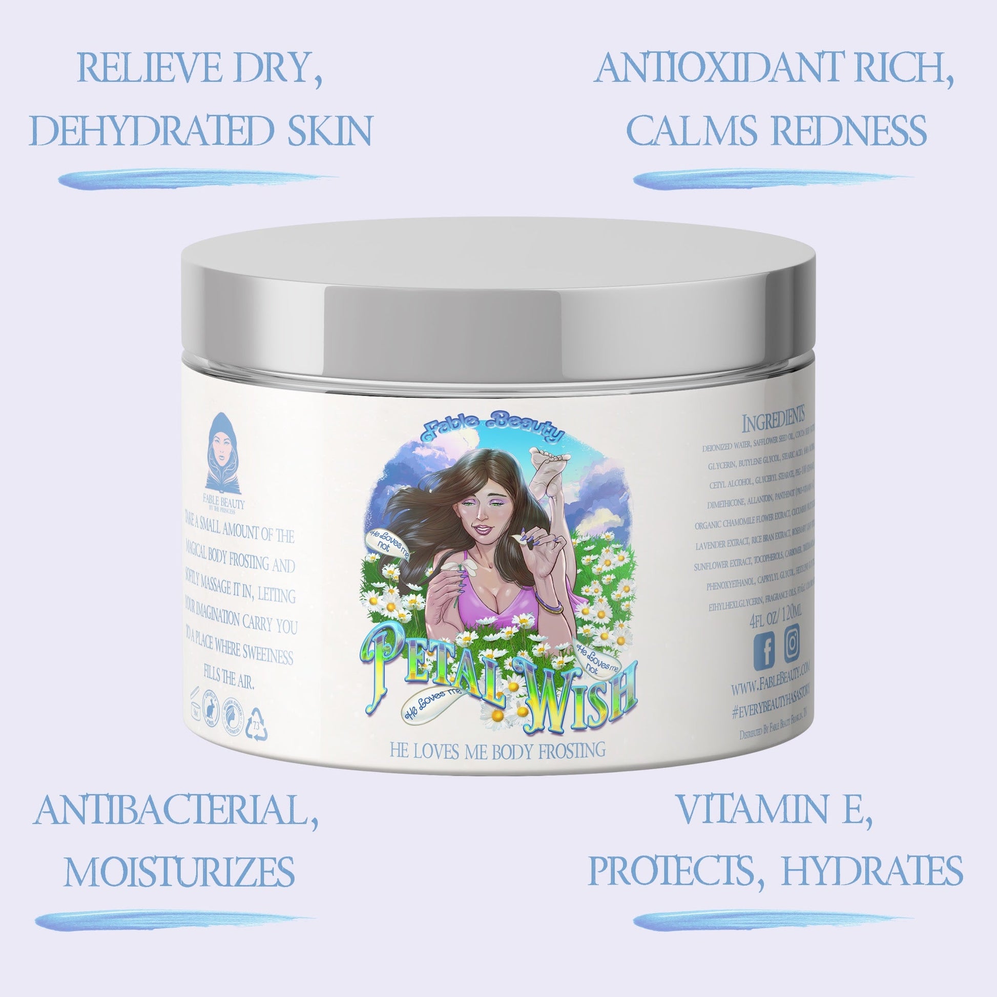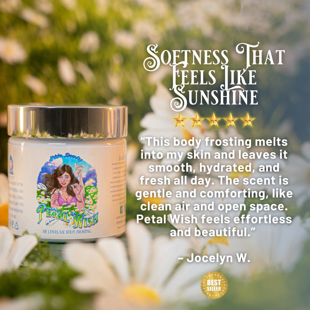 Step into the airy, sunlit world of Petal Wish—a skincare duo designed for velvety smoothness, lasting hydration, and a glow that feels effortlessly fresh. This indulgent set pairs our Sugar Scrub and Body Frosting to gently polish, deeply pamper, and leave your skin soft, luminous, and beautifully renewed.