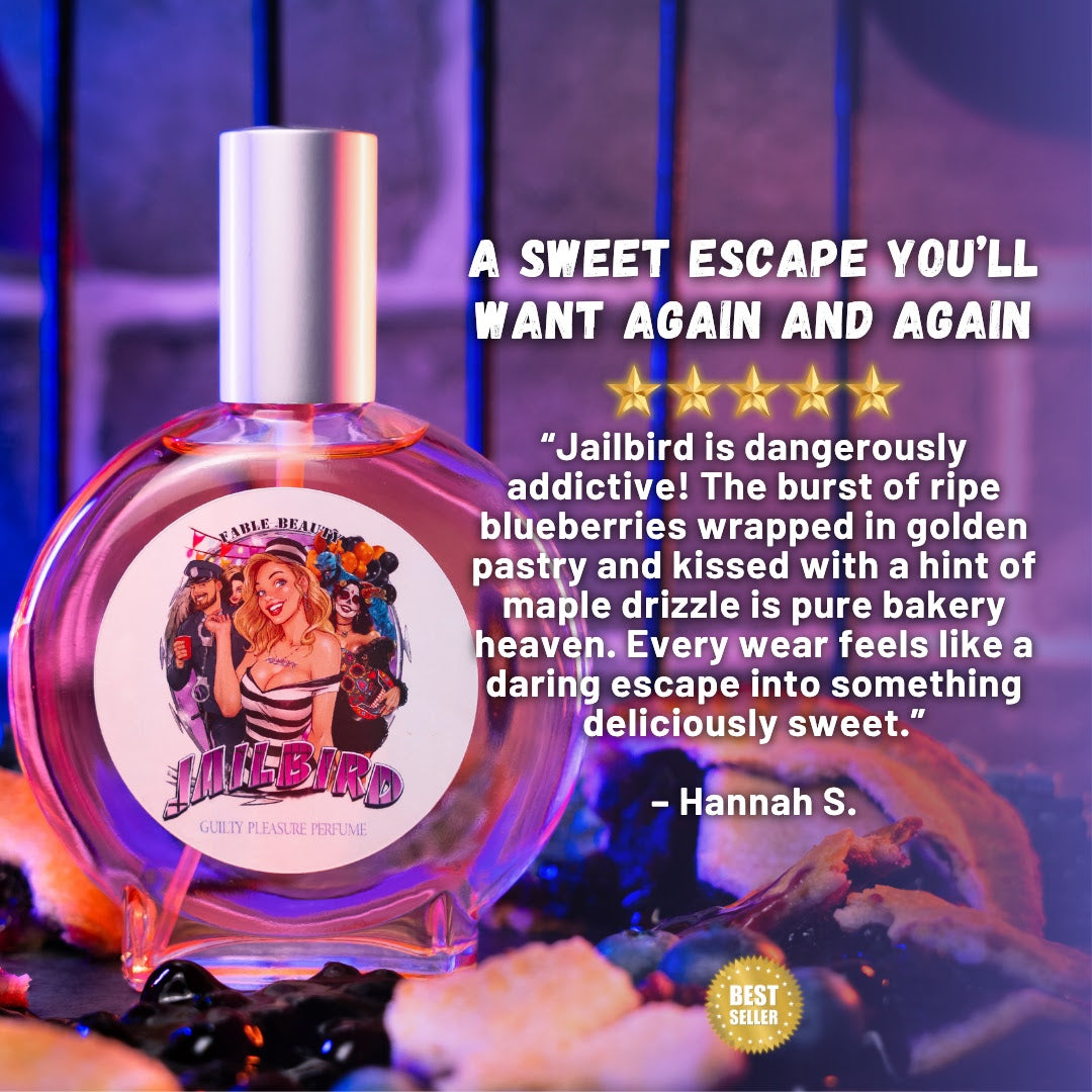 Crafted in the USA and phthalate-free, The Jailbird is a decadent 100ml perfume elixir that wraps you in the warm sweetness of ripe blueberries, golden pastry, and a drizzle of rich maple—turning every spritz into a stolen moment.